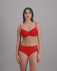 Our Alison Full Coverage Underwire bra in classic Salsa featuring luxurious large scale floral lace with recycled yarns for a beautiful feminine look with incredible support.