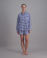 The Cosy Flannel short in a warm brushed cotton blend fabric is perfect for lounging and slow mornings, coming in a Blue Check colourway.